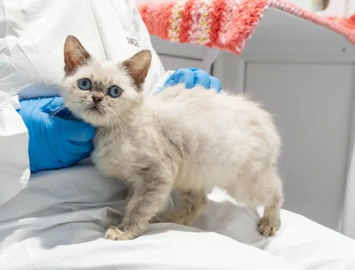 Esme arrived at Woodgreen cold, underweight, and so tiny that we warmed her up in a guinea pig bed. Her front leg was crooked, but a muscle disorder couldn’t dim her bright spirit. With weekly vet checks and daily exercises, Esme grew stronger and found a loving home.