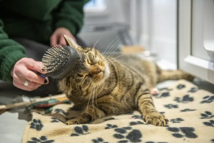 Arnold was found abandoned, scruffy and unwell. At Woodgreen, he was diagnosed with ringworm and placed on a treatment plan. We settled him into a cosy space to recover. Three months later came his first negative test result, and he could finally head to his happy new home.